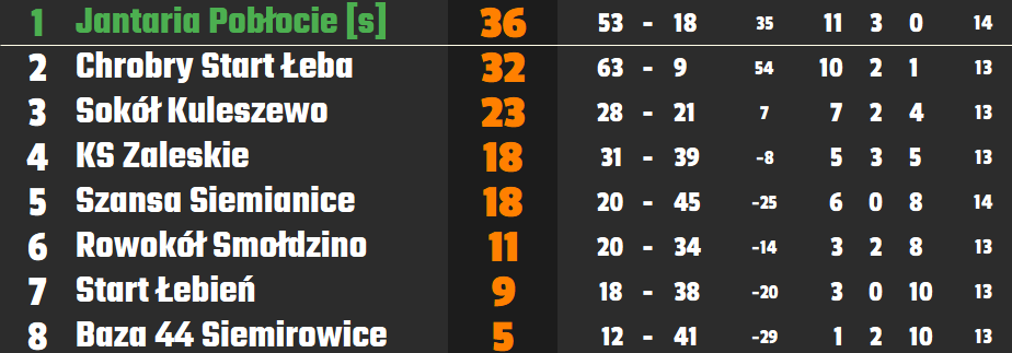 Gospodarze pod koniec pierwszej połowy za sprawą bramki Sebastiana Wiśniewskiego wyszli na prowadzenie w tym meczu. Chwilę później zawodnik z Pobłocia zobaczył czerwoną kartkę i goście po przerwie grali w dziesięciu. To osłabienie nie przeszkodziło im w tym, żeby na dwie minuty przed końcem regulaminowego czasu doprowadzić do wyrównania. Paweł Domański zdobył gola, jak się potem okazało, na miarę awansu. Ostatnie kilka minut Jantaria broniła szczęśliwego wyniku w dziewięciu po kolejnej czerwonej kartce dla jednego z ich zawodników. Emocje zatem były, ale wynik się już nie zmienił. Start Łeba zremisował zremisował 1-1 z Jantarią Pobłocie i tym samym goście w przyszym sezonie zagrają w Klasie A.