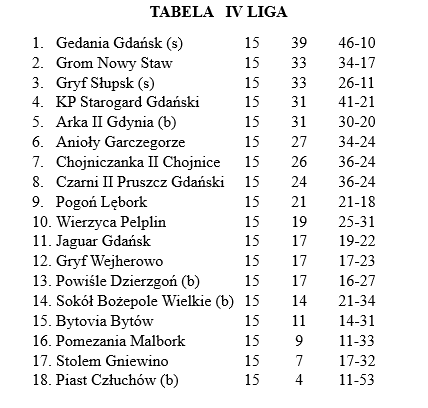 Podsumowując, w czwartej lidze do końca sezonu będzie niezwykle interesująco, co można było przypuszczać przed startem. Gra o bezpośredni awans do trzeciej ligi będzie się toczyć wśród kilku drużyn. W lipcu wielu obserwatorów stawiało głównie na KP Starogard Gdański, gdzie ściągnięto graczy z bogatym doświadczeniem. Ich dotychczasowe wyniki są jednak nie najlepsze, z czego korzystają inne zespoły. Duże słowa uznania należą się Gedanii, która po spadku z trzeciej ligi w obecnej kampanii spisuje się bardzo dobrze. Równie zadowoleni mogą być w Gdyni, Nowym Stawie czy Słupsku, gdzie nadal mają niedużą stratę do lidera, którą na wiosnę będą się starali redukować.