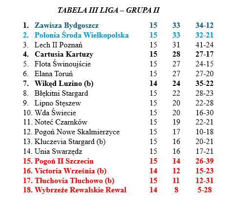 Po piętnastu rozegranych kolejkach Cartusia Kartuzy znajduje się wśród czołowych zespołów w drugiej grupie trzeciej ligi. Aktualnie pierwsze miejsce w tabeli z dorobkiem 33 punktów zajmuje Zawisza Bydgoszcz, tuż przed Polonią Środą Wielkopolską (również z takim samym dorobkiem) i rezerwami Lecha Poznań, który ma dwa punkty mniej. Cartusia jest na wysokiej, czwartej pozycji i do lidera z Bydgoszczy traci jedynie pięć oczek.