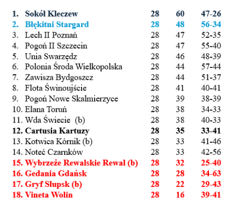 Najlepszą pozycję z całej trójki ma Cartusia. Nie oznacza to jednak, że w Kartuzach mogą spać spokojnie. Dwunaste miejsce w tabeli i 35 punktów na koncie oznacza nadal trudną sytuację, ponieważ to tylko trzy punkty nad strefą spadkową. W ostatnich trzech meczach Cartusia zdobyła cztery punkty, więc jeżeli chce myśleć o spokojnej końcówce sezonu to musi jeszcze poprawić swoją grę. A jak wygląda ich terminarz?