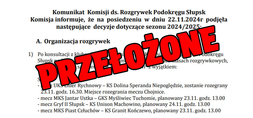 Słupska Klasa Okręgowa: Część meczów przełożonych Słupska Klasa Okręgowa: Część meczów przełożonych 22 listopada 2024 foto: Pomorski Związek Piłki Nożnej Część… 22 listopada 202422 listopada 2024