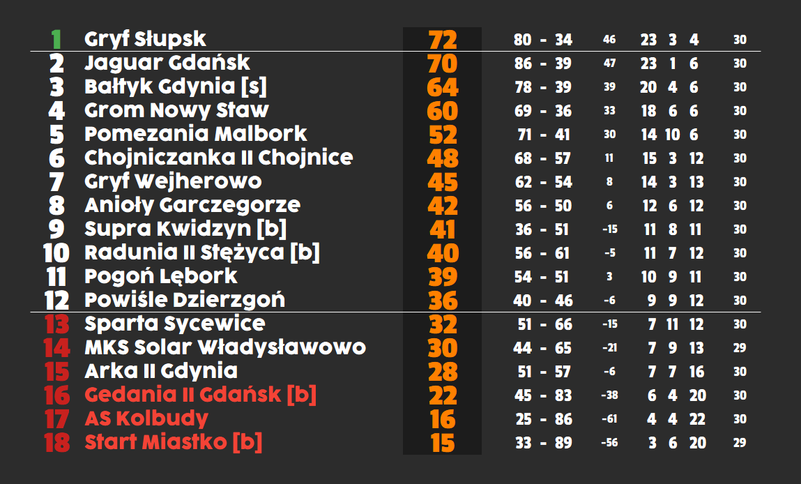 4.ligę może opuścić aż sześć zespołów. Wszystko rzecz jasna za sprawą spadków z 3.ligi. Start Miastko, AS Kolbudy i Gedania II Gdańsk już nie mają szans na utrzymanie. Blisko degradacji jest też Arka II Gdynia. Kolejnych dwóch spadkowiczów poznamy z grona MKS Solar Władysławowo, Sparta Sycewice i Powiśle Dzierzgoń. Gdyby sprawy związane z licencjami w wyższych ligach potoczyłyby się tak, że jednak z 3.ligi spadną tylko dwie pomorskie drużyny, to wtedy zespół z 13. pozycji (obecnie jest to finalista Wojewódzkiego Pucharu Polski Sparta Sycewice) może się jednak utrzymać.